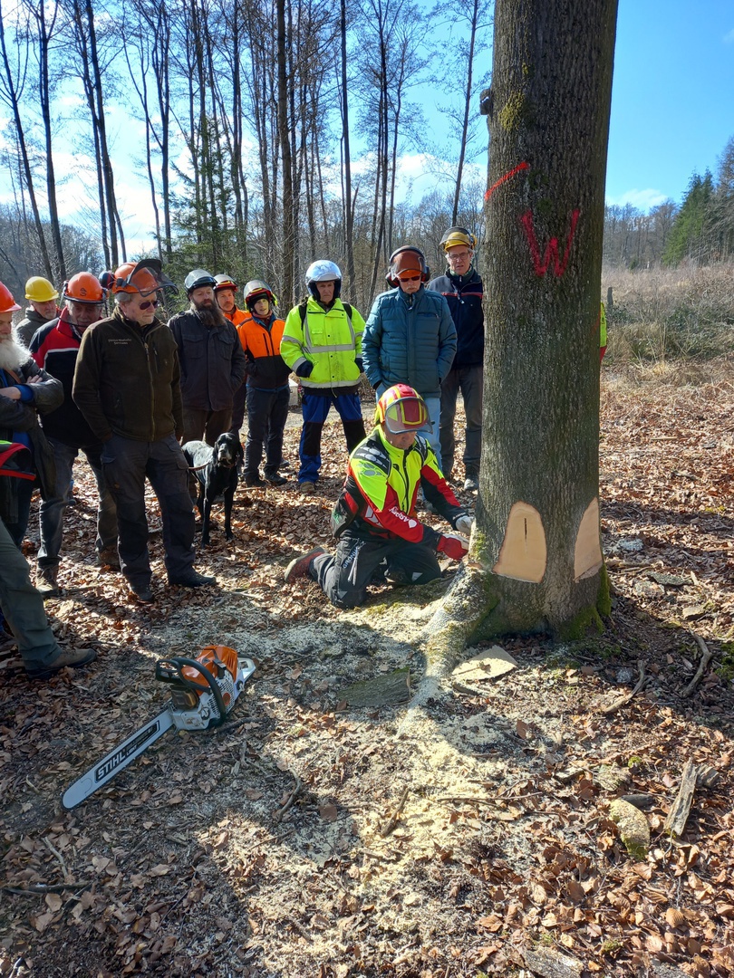 Nach der wohlverdienten Mittagspause ging es dann in den nahegelegenen Wald auf der „Linzer Höhe“ zum praktischen Teil. Hier wurden drei Buchen von unterschiedlicher Stärke und Schadbild gefällt. Die erste Buche mit einem Durchmesser von rd. 50 cm wurde mit Unterstützung einer Seilwinde zu Fall gebracht. Hierbei wurde auch demonstriert, wie das Seil in einer Höhe von ca. 5 m mit der „Königsbronner Anschlagtechnik“ befestigt wurde. Bei größeren Höhen bis ca. 15 m kommt eine Wurfbeutelschleuder (DST) zum Einsatz. Zum Abschätzen der aufzuwendenden Zugkraft in unterschiedlichen Anschlagshöhen hat sich in der Praxis die „Calmbacher Tabelle“ bewährt. Nachdem der Baum problemlos gefällt war, staunten alle über das „Schnitt- und Stockbild“: selbst der Referent gab an, so etwas in seiner über 30jähren Praxis noch nicht erlebt zu haben. Ohne Einsatz der Seilwinde wäre es hier zu Problemen gekommen. Bei der zweiten Buche -kleiner im Durchmesser aber problematischer im Wuchs- wurden einfache Keile zur Hilfe genommen und bei der dritten Buche kam ein sog. „Spindelkeil“ zum Einsatz. Auch diese Fällung war nicht zuletzt aufgrund der ungünstigen Windverhältnisse schwierig. Fazit: Alle Teilnehmer und auch der Referent waren mit dem Lehrgang sehr zufrieden und der Dank von Uwe Werner an Konrad Scholzen wurde mit großem Beifall begleitet. Ebenfalls ging ein Dank an Förster Dieter Steinebach für die Vorbereitung und an den Forstbetrieb Joser Lorscheid aus St. Katharinen für die Bereitstellung des Übungsbestandes und den Maschineneinsatz. Abschließend wurde allen Teilnehmern eine Lehrgangs-Bescheinigung vom Geschäftsführer des KWBV Martin Werner übergeben.